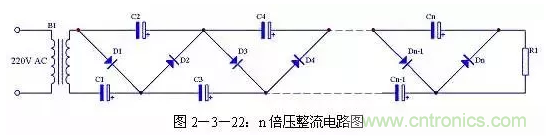 二倍壓電路還可以很容易的擴展為n倍壓電路,具體電路見圖2-3-22。