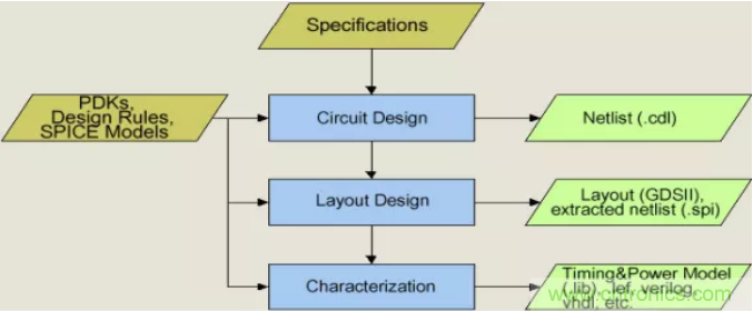 對于數字電路中的標準單元設計,是從布爾邏輯(Boolean logic)描述并定義單元的邏輯關系開始,接著是電路設計(schematic capture或circuit design)與電路仿真(circuit simulation),而后開始版圖設計。版圖設計需要符合制造工藝規則檢查(design rule check,DRC)和版圖電路一致性檢查(layout versus schematic,LVS)通過才算完成,這時,版圖設計的結果用“圖形顯示系統第二版”(graphic display system II,GDSII)文件記載,并作為芯片制造中制作掩模板(mask)的依據。數字電路的標準單元和I/O單元完成版圖設計后,還要做寄生參數(電阻R電容C)提取(parasitic extraction,RCX),供電路設計者作進一步擬合優化處理,這種反標方法(back-annotation)也是芯片級設計的重要步驟之一。圖2給出了比較完整的版圖設計全流程圖。