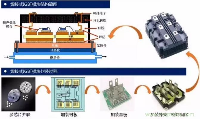 IGBT模塊按封裝工藝來看主要可分為焊接式與壓接式兩類。高壓IGBT模塊一般以標(biāo)準(zhǔn)焊接式封裝為主,中低壓IGBT模塊則出現(xiàn)了很多新技術(shù),如燒結(jié)取代焊接,壓力接觸取代引線鍵合的壓接式封裝工藝。