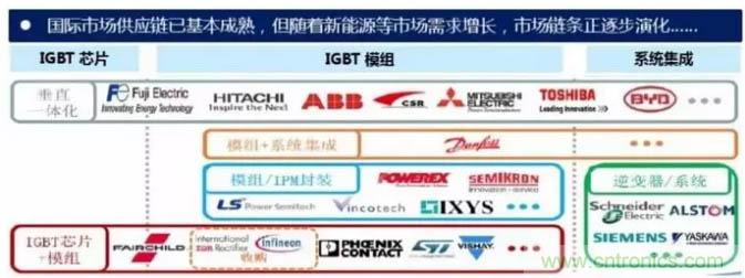從公司來看,國(guó)外研發(fā)IGBT器件的公司主要有英飛凌、 ABB、三菱、西門康、東芝、富士等。中國(guó)功率半導(dǎo)體市場(chǎng)占世界市場(chǎng)的50%以上,但在中高端MOSFET及IGBT主流器件市場(chǎng)上,90%主要依賴進(jìn)口,基本被國(guó)外歐美、日本企業(yè)壟斷。