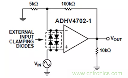 圖9:在ADHV4702-1輸入端接入外部二極管,可通過限制該器件的差分輸入電壓,保護其不受升壓電路大電流產生的熱效應影響。(圖片來源:Analog Devices)