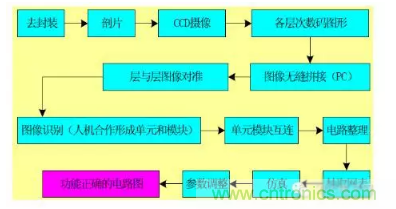 用大俗話來說,找一塊有用的芯片,照照相、制制版、提提圖、畫畫圖、仿仿真,芯片電路就反求了出來;編編工藝、設(shè)計(jì)工裝、將生產(chǎn)線開動(dòng),芯片又做了出來;再做做測(cè)試、進(jìn)行老化,芯片就可以上市了。這就是集成電路反向開發(fā)的各道工序、完整流程。下面這張圖就說明了全過程。