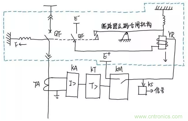 圖中的KA是一個電流繼電器,屬于測量比較元件。它通過測量回路接受來自電流互感器TA二次側的電流,并且和整定值進行比較。如果輸入電流大于整定值,電流繼電器觸點閉合,這個觸點的閉合就是一個邏輯信號。這個邏輯信號會啟動時間繼電器KT,這個時間繼電器屬于邏輯判斷元件。時間繼電器(邏輯判斷元件)接收到電流繼電器(測量比較元件)的邏輯信號,經過整定的時間延時(邏輯運算)之后,如果輸入的邏輯信號不變,則將跳閘指令傳給執行輸出部分,啟動中間繼電器KM(執行輸出元件),使KM接點閉合,通過控制回路使跳閘線圈YR帶電,斷路器跳開;同時通過信號回路使信號繼電器KS發出動作信號,提醒運行人員保護動作。