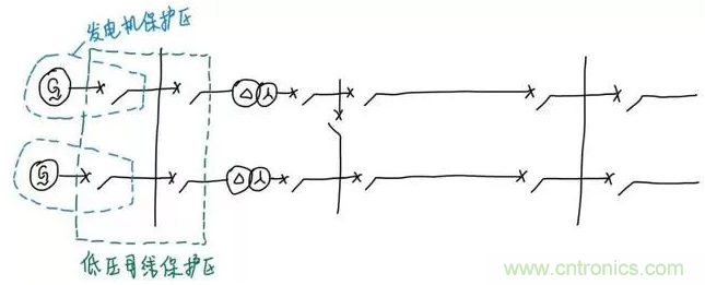我們繼續往后看。可以看到發電機接到了低壓母線,對于這個低壓母線的保護來說,要做到故障時只停母線而不停其它設備,只要讓保護在故障時切除和母線直接連接的四個斷路器就可以了。所以四個斷路器旁邊的電流互感器圍成的范圍就是這條母線保護的保護范圍。