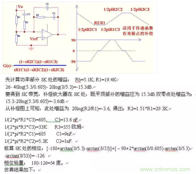 此圖為補償放大部分原理圖.RHZ的頻率為33K,為了避免其引起過多的相移,一般取帶寬為其頻率的1/4-1/5,我們?nèi)?/4為8K.