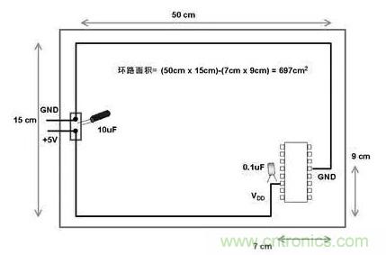 電源線和地線配合不當(dāng)?shù)腜CB設(shè)計示例如圖2所示,此電路板上,設(shè)計出的環(huán)路面積為697cm²。采用圖3所示的方法,電路板上或電路板外的輻射噪聲在環(huán)路中感應(yīng)電壓的可能性可大為降低。