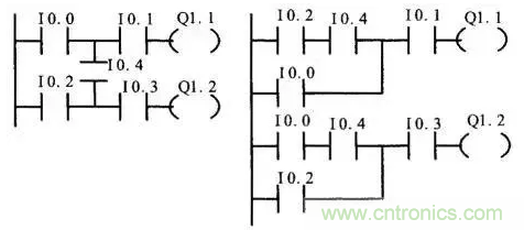 (3)幾個串聯(lián)支路相并聯(lián),應(yīng)將觸點(diǎn)多的支路安排在上面;幾個并聯(lián)回路的串聯(lián),應(yīng)將并聯(lián)支路數(shù)多的安排在左面。按此規(guī)則編制的梯形圖可減少用戶程序步數(shù),縮短程序掃描時間。