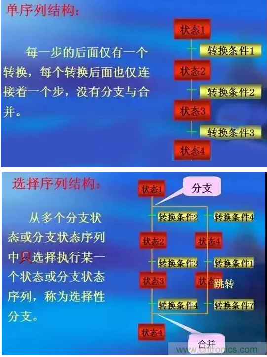 功能表圖的基本結(jié)構(gòu):單序列結(jié)構(gòu)、選擇序列結(jié)構(gòu)、合并序列結(jié)構(gòu)