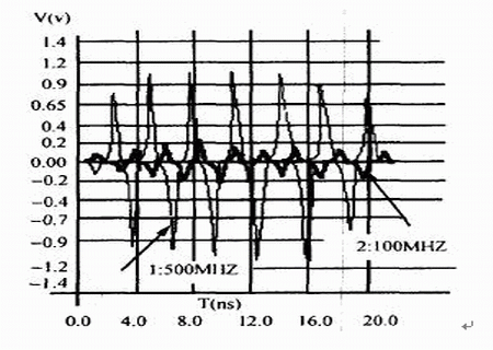 干擾源信號頻率越高,被干擾對象上的串?dāng)_幅值越大,我們對圖1中干擾源網(wǎng)絡(luò)AB上的信號頻率f1分別取不同頻率值時,對被干擾對象上的串?dāng)_進(jìn)行了仿真,仿真結(jié)果見表2,信號頻率不同時的串?dāng)_波形見圖5,標(biāo)記為“1”、“2”箭頭所指的波形頻率分別為“500MHz”、“100MHz”。