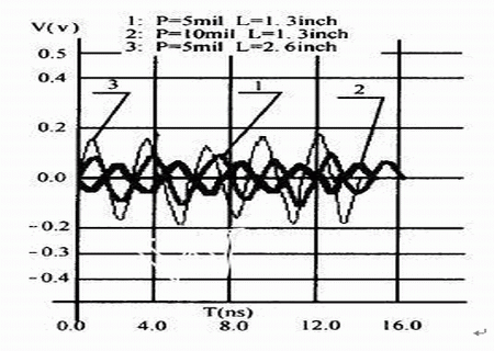 對于圖1所示的兩線系統(tǒng),我們進(jìn)行了三種情況的仿真(線網(wǎng)AB上的信號頻率均為100MHz)仿真結(jié)果見表3,及圖6.:第一種情況是在兩線間距和平行長度不變的條件下,探測被干擾對象的串?dāng)_(標(biāo)記“1”);第二種情況是在兩線平行長度不變的前提下,將兩線間距增加到10mils,然后探測被干擾對象的串?dāng)_標(biāo)記“2”;第三種情況是在兩線間距不變的條件下,將兩線的平行長度增加到2.6inches標(biāo)記“3”,然后探測被干擾對象的串?dāng)_。由仿真結(jié)果可見,當(dāng)兩線的間距拉大時(P由5mils變?yōu)?0mils),串?dāng)_明顯地減小了,而當(dāng)兩線的平行長度加長時(L由1.3inches變?yōu)?.6inches),串?dāng)_顯著增大了。