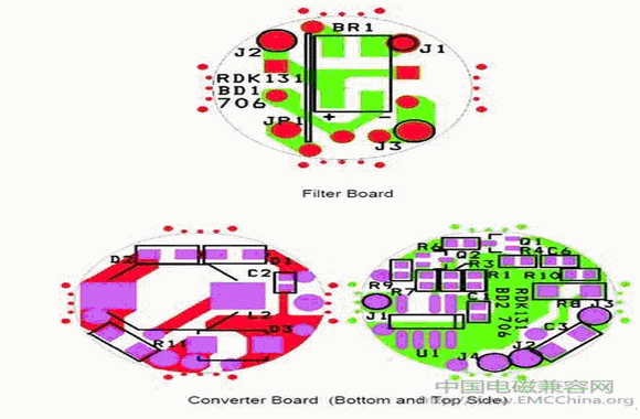 雖然該設計具有功能性,但仍存在傳導輻射問題。由于兩個PCB比較接近,開關電流會從轉換器電路板耦合到EMI濾波器電路板,從而降低EMI濾波器的性能。通過在這兩個電路板之間放置“屏蔽”PCB,這一問題便得以解決。而第三個電路板只是一層銅,并無電路。它被電氣連接到EMI濾波器負輸出端與轉換器負輸入端的接合處。這樣,總裝便由三個疊加在一起的圓形電路板組成。增加第三個電路板既簡單又節省成本,不但解決了耦合問題,還達到了EMI性能要求。