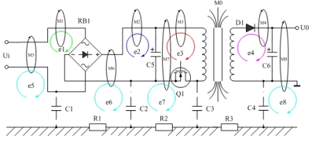 圖8是磁感應(yīng)產(chǎn)生傳導(dǎo)干擾的原理圖,圖8表示開關(guān)電源變壓器產(chǎn)生的漏磁通穿過其它電路時(shí),在其它電路中也產(chǎn)生感應(yīng)電動(dòng)勢,其中漏磁通M1、M2、M3產(chǎn)生的感應(yīng)電動(dòng)勢e1、e2、e3屬于是差模干擾信號;M5、M6、M7、M8產(chǎn)生的感應(yīng)電動(dòng)勢e5、e6、e7、e8屬于是共模干擾信號。