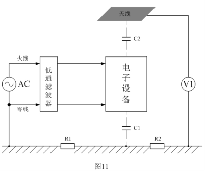 輻射干擾一般是通過電磁感應(yīng)的形式在空間進(jìn)行傳播的,圖11是測試電子設(shè)備產(chǎn)生輻射干擾的基本方法,或表示電子設(shè)備產(chǎn)生的干擾信號通過電磁感應(yīng)向空中輻射的原理。圖11中,電子設(shè)備表示干擾信號源,V1表示測量儀表,C1表示電子設(shè)備對大地的電容,C2表示電子設(shè)備與天線偶合的電容,即:電子設(shè)備通過電場對天線產(chǎn)生感應(yīng),這里的天線也可以看成是被干擾的設(shè)備。圖11的測試方法就是測試電子設(shè)備周圍規(guī)定距離某處的電磁場強(qiáng)度,由于干擾信號一般都是一個(gè)頻率成份非常豐富的非正弦波,因此,無法對它進(jìn)行直接測量,只能對它其中某一個(gè)頻率信號單獨(dú)進(jìn)行測量。