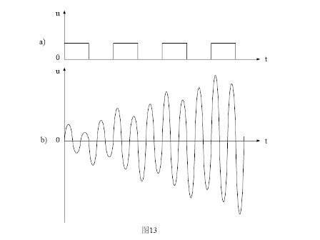 圖13是諧振回路產(chǎn)生諧振的工作原理圖。圖13-a)是一個(gè)含有諧波分量非常豐富的電壓方波,圖13-b)是LC串聯(lián)回路產(chǎn)生諧振時(shí)的電壓波形。當(dāng)電壓方波作用于LC串聯(lián)回路時(shí),方波的前后沿都會(huì)對LC串聯(lián)回路產(chǎn)生激勵(lì)(即接收能量),每次激勵(lì)過后又會(huì)產(chǎn)生阻尼振蕩(即損耗能量),當(dāng)輸入電壓波形的上升率dv/dt值大于諧振回路波形(正弦波)的上升率時(shí),電路就會(huì)產(chǎn)生激勵(lì);當(dāng)輸入電壓波形的上升率dv/dt值小于諧振回路波形的上升率時(shí),電路就會(huì)產(chǎn)生阻尼。