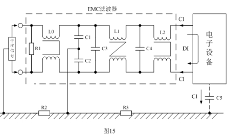 根據EMC的定義或原理,EMC濾波電路不但要抑制本電子設備產生的電磁干擾,同時也要對外來的電磁干擾信號進行抑制,因此,圖14所示的EMC濾波電路還不是十分完美的。為了提高EMC濾波電路對外來電磁干擾信號的抑制能力,最好在輸入端也安裝一個低通濾波器,并且這個低通濾波器對本電子設備產生的電磁干擾也有很強的抑制能力。