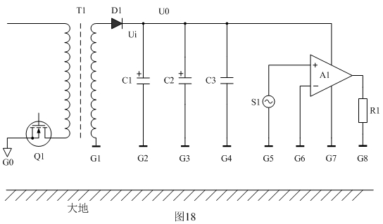下面我們以圖18為例來分析地線對EMC產生的影響。圖18中Q1表示開關電源,T1為開關變壓器,D1為整流二極管,C1、C2、C3為濾波電容器,A1為功率放大器,S1為功率放大器輸入信號,R1為功率放大器輸出負載,G1、G2、G3、G4、G5、G6、G7、G8為各個器件的地;Ui表示整流輸出電壓,Uo表示經過濾波后的輸出電壓。
