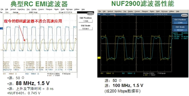 圖4:典型RCEMI濾波器與高速LCEMI濾波器(NUF2900)的響應性能比較。