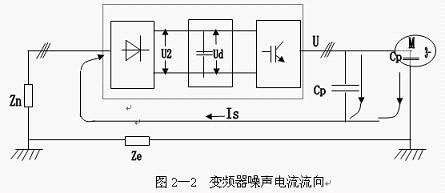 寄生電容Cp存在于電機電纜和電機內部,因此變頻器的PWM輸出電壓波形的開關翼部通過寄生電容產生一個高頻脈沖電流Is,使變頻器成為一個諧波干擾源。由于諧波電流Is的產生源是變頻器,因此它一定要流回變頻器。圖中Ze為大地阻抗,Zn為動力電纜與地之間的阻抗。諧波電流流過此二阻抗所造成的電壓降,將影響到同一電網上的其它設備造成干擾。[page]