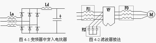 2)濾波器;在變頻器的輸入輸出側電路中,除上述較低次的諧波成份外,還有許多頻率較高的諧波電流,它們將以各種方式形成對其他設備的干擾信號,濾波器就是用于削弱頻率較高的諧波分量的方法(如圖4-2所示)。