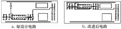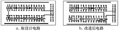 圖2取自某雷達(dá)發(fā)射機(jī)磁場(chǎng)控制保護(hù)PCB的部分電路。重新布局元器件后改進(jìn)的PCB電路(如圖2b)較改進(jìn)前的PCB電路(如圖2a)在抗干擾性能上有很大的改善。