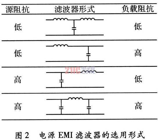 Cy用于抑制較高頻率的共模干擾信號,取值范圍一般為2200~6800 pF。常選用自諧振頻率較高的陶瓷電容。由于接地,共模電容Cy上會產生漏電流Ii-d。因為漏電流會對人體安全造成傷害,所以漏電流應盡量小,通常<1.0 mA。共模電容取值與漏電流大小有關,所以不宜過大,取值范圍一般為2200~4700 pF。R為Cx的泄放電阻。電源濾波器的性能很大程度上取決于其端阻抗,根據信號傳輸理論,濾波器輸入端與電源端的端接、濾波器輸出端與負載端的端接應遵循阻抗極大不匹配原則。因此,濾波器設計時應遵循:(1)源內阻是高阻(低阻)的,濾波器輸入阻抗就應該是低阻(高阻);(2)負載是高阻(低阻)的,則濾波器輸出阻抗就應該是低阻(高阻)。對EMI信號來說,電感是高阻,電容是低阻,則有圖1中的4種濾波器選用類型。