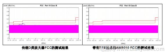 下面是傳統(tǒng)D類放大器和帶有EEE技術(shù)的AW8010的EMI測(cè)試結(jié)果,測(cè)試使用60cm(24inch)的輸出線。上面的紅色實(shí)線是FCC CLASS B的標(biāo)準(zhǔn)線,紅色虛線是-6dB的裕量線,藍(lán)色的線是實(shí)際測(cè)試曲線,粉色的線是測(cè)試環(huán)境的EMI背景噪音。
