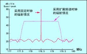 所謂的“擴展頻譜時鐘”是一項能夠減小輻射測量值的新技術,但這并非真正減小了瞬時發射功率,因此,對一些快速反應設備仍可能產生同樣的干擾。這種技術對時鐘頻率進行1% ~ 2% 的調制,從而擴散諧波分量,這樣在CISPR16或FCC發射測試中的峰值較低。所測的發射減小量取決于帶寬和測試接收機的積分時間常數,因此這有一點投機之嫌,但該項技術已被FCC所接受,并在美國和歐洲廣泛應用。調制度要控制在音頻范圍內,這樣才不會使時鐘信號失真,圖2是一時鐘諧波發射改善的例子。擴展頻譜時鐘不能應用于要求嚴格的時間通信網絡中,比如以太網、光纖、FDD、ATM、SONET和ADSL。