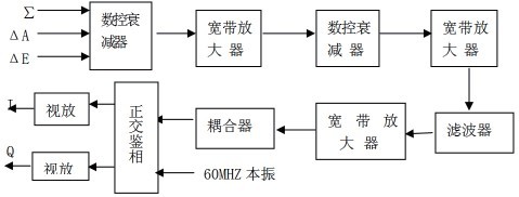 視頻接收組合是由I/Q正交鑒相器和視頻放大器組成。其中應(yīng)用數(shù)控衰減器實時調(diào)整各路本振信號的相位,以達到補償接收機系統(tǒng)相位一致性的目的。最后輸出反射和應(yīng)答的12路I/Q信號以及反射和應(yīng)答的檢波信號。