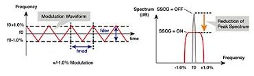 某一大型半導體廠商在解串器的并行總線上實現了SSCG功能。SSCG功能能夠通過將輻射峰值能量擴展到更寬的頻帶上來減少輻射。如下面的圖1所示,頻率變化發生在額定時鐘中心頻率(中心擴頻調制)附近,擴展的頻譜為正或負1.0%(fdev)。在接收器并行總線端,輸出以千赫茲(fmod)的調制速率隨時間調制時鐘頻率和數據頻譜。定制的串行解串器芯片組的目標客戶是要求所安裝電子設備具有低EMI輻射特性的汽車廠商。