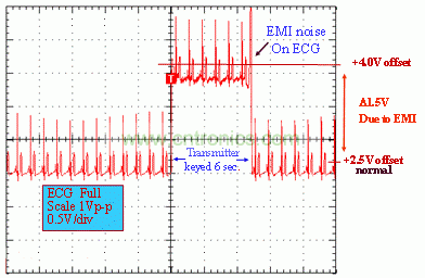 圖 1 1.5 英尺以外的發(fā)射器(f = 470 MHz, P= 0.5W)開(kāi)啟和關(guān)閉時(shí) ECG 診斷設(shè)備的心臟檢查結(jié)果