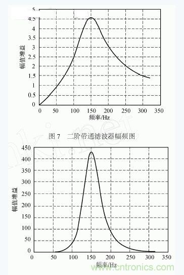 為此,我們對信號進(jìn)行較高Q值的窄帶濾波,使用二階壓控型有源帶通濾波器作為濾波單元,其原理圖及頻率特性如圖6、7所示。