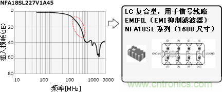 信號頻率為12MHz,同去除噪音所必須的頻帶700MHz相比頻率較低,為了接近信號頻率通過所必須的頻帶 (~100MHz) ,選擇了插入損耗曲線變化急劇,對信號頻率和噪音頻率選擇度較高的LC復合型EMI濾波器。因為信號線路很多,所以EMI濾波器為排容型NFA18SL系 列。在檢查靜噪效果和信號質量之間平衡的同時,我們選擇了220MHz的截止頻率。