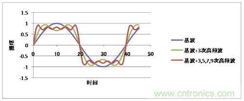 下圖所示的是正弦波的高頻波(擁有基本波整數(shù)倍頻率的波)重疊而成的例子,可以看到當(dāng)高頻波越多圖形就越接近矩形波。矩形波相當(dāng)于這些高頻波持續(xù)重疊在一起的波紋。