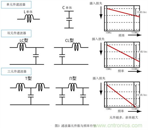 圖 3顯示了組成濾波器的元件數與濾波器頻率特性之間的關系。想知道什么是插入損耗,可以看一下圖中各濾波器的信號衰減量,圖越往下衰減量越多。從圖上我們可 以看到,濾波器中的元件越多,頻率特性的斜率就越大。元件較少的濾波器的頻率特性范圍較窄(斜率較?。?,衰減頻率及通過頻率的選擇度較低,有可能導致部分 信號衰減或者噪聲沒有徹底去除。另一方面,元件較多的濾波器的頻率特性范圍較寬(斜率較大),頻率的選擇度較高,信號可以在幾乎不衰減的狀態下去除噪聲。