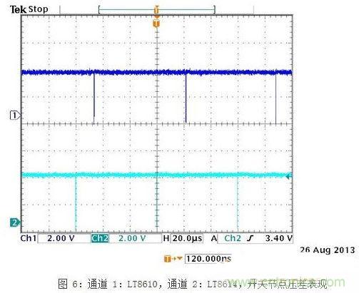 圖 5顯示了13.2V輸入的開關節點。可以看到,LT8614與理想方波的偏離極小,如通道2所示。圖3、4和5中的所有時間域測量結果都是用 500MHzTektronixP6139A探頭測得的,封閉的探頭尖端屏蔽罩連接至PCBGND平面,測試均在標準演示電路板上進行。[page]
