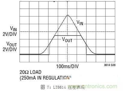 除了面向汽車環境的42V絕對最大輸入電壓額定值,器件的壓差表現也非常重要。常常需要支持至關重要的3.3V邏輯電源以應對冷車發動情況。在這種情況 下,LT8614SilentSwitcher穩壓器保持接近LT861x系列的理想表現。LT8610/11/14器件不是像其他器件那樣提供更高的欠 壓閉鎖電壓和最大占空比箝位,而是以低至3.4V的電壓工作,而且只要有必要,就跳過若干周期,如圖6所示。這樣就產生了理想的壓差表現,如圖7所示。