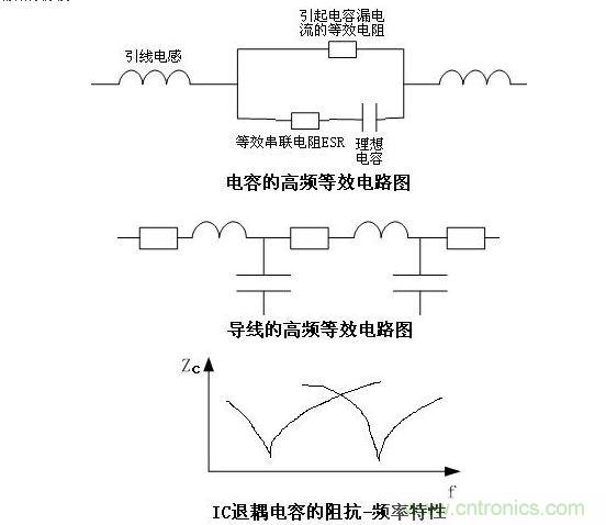 電容,在中低頻或直流情況下,就是一個儲能組件,只表現為一個電容的特性,但在高頻情況下,它就不僅僅是個電容了,它有一個理想電容的特性,有漏電流(在高頻等效電路上表現為R),有引線電感,還在導致電壓脈沖波動情況下發熱的ESR(等效串聯電阻),(如圖)。從這個圖上分析,能幫我們設計師得出很多有益的設計思路。第一,按照常規思路,1/2πfc是電容的容抗,應該是頻率越高,容抗越小,濾波效果越好,即越高頻的雜波越容易被泄放掉,但事實并非如此,因為引線電感的存在,一支電容僅僅在其1/2πfc=2πf L等式成立的時候,才是整體阻抗最小的時候,濾波效果才最好,頻率高了低了都會濾波效果下降,由此就可以分析出結論,為什么在IC的VCC端都會加兩支電容,一支電解的,一支瓷片的,并且容值一般相差100倍以上多一點。就是兩支不同的電容的諧振頻率點岔開了一段距離,既利于對稍高頻的濾波,也利于對較低頻的濾波。