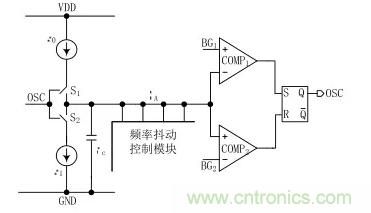 由圖1可以看出,頻率抖動(dòng)振蕩器由一個(gè)張弛振蕩器加上一個(gè)頻率抖動(dòng)模塊構(gòu)成。其工作原理:首先,開(kāi)關(guān) S1閉合,電流源 I0給電容 Cc充電,充電剛開(kāi)始時(shí)電容 Cc上極板的電壓小于 BG1和 BG2,RS 觸發(fā)器的輸出被置為低電平 0,當(dāng)電容上極板電壓 VA大于 BG2時(shí),RS 觸發(fā)器的輸出狀態(tài)處于保持狀態(tài),直到上極板電壓 VA大于 BG1之后 RS 觸發(fā)器的輸出翻轉(zhuǎn)被置為高電平1;此時(shí),開(kāi)關(guān) S2導(dǎo)通,電流源 I1給電容Cc放電,當(dāng)VA減小到小于 BG1時(shí),RS 觸發(fā)器的輸出處于保持狀態(tài),當(dāng)VA減小到小于 BG2時(shí),RS 觸發(fā)器翻轉(zhuǎn)被置為低電平 0 ;于是,開(kāi)關(guān) S1又閉合開(kāi)始對(duì) Cc充電,如此周而復(fù)始,得到一個(gè)頻率固定的振蕩器。圖1中的電流源I0、 I1的電流相等,則振蕩器的占空比為 0.5。頻率抖動(dòng)控制模塊是通過(guò)計(jì)數(shù)器來(lái)周期性的切換加入到張弛振蕩器中充放電電容的大小,改變電壓 VA的充放電速度,從而來(lái)達(dá)到周期性的改變振蕩器頻率的目的,即實(shí)現(xiàn)了振蕩器頻率的抖動(dòng)。