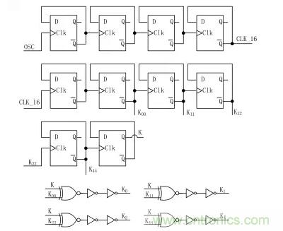 本文中所設(shè)計(jì)的頻率抖動(dòng)控制模塊是通過(guò)計(jì)數(shù)器來(lái)控制圖 2 中 M6~ M12開(kāi)關(guān)管的通斷來(lái)周期性的改變充放電電容的大小來(lái)實(shí)現(xiàn)的。頻率抖動(dòng)控制模塊的電路圖如圖 3 所示,由7 個(gè) D 觸發(fā)器串聯(lián)構(gòu)成 512 分頻觸發(fā)器,第 8 個(gè) D 觸發(fā)器的輸出信號(hào)加入到異或門(mén)用于實(shí)現(xiàn)計(jì)數(shù)器 K4,K2,K1,K0加減法計(jì)數(shù)切換,保證加入到張弛振蕩器中的電容不會(huì)出現(xiàn)瞬時(shí)的大容值的變換,從而引起振蕩器的振蕩頻率有過(guò)大的變化。本文中所設(shè)計(jì)振蕩器的中心頻率為100 kHz,頻率抖動(dòng)范圍為±4 kHz,頻率從 96 kHz,100 kHz,104 kHz 周期性地變化,頻率抖動(dòng)周期為 5 ms。