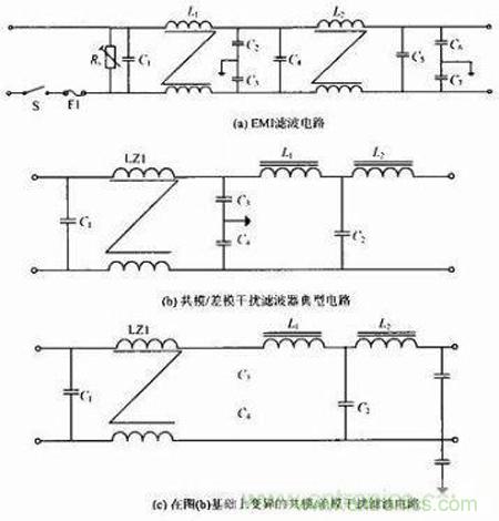 開關電源對內、外的干擾及抗干擾中,共模信號與開關器件的工作方式、散熱器的安裝及整機PCB板與機殼的連接有相當復雜的關系,共模信號在一定 的條件下又可轉變成差模信號。其中解決共模干擾除了上述一般的EMI濾波電路,還可按如下電路圖的思想在電路上改進,使開關電源能夠在電路上改進從而提高 性能。圖1(b)為共模/差模干擾濾波器典型電路,圖1(c)為在圖1(b)基礎上變異的共模/差模干擾濾波電路。