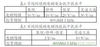 在過去關于醫療設備抗電磁干擾的標準中,往往僅考慮醫療設備在醫院內的使用情況。但隨著科技的發展,許多設備逐漸變得輕巧、簡便,方便患者在各個地點使用,特別是一些便攜式、植入式及可穿戴的醫療設備。例如植入式的心臟起搏器,要保證在各種場所能正常安全地工作,不會被其他電子發射信號或設備干擾。因此IEC60601-1-4《醫用電氣設備第1-4部分:基本安全和必要性能的通用要求:電磁干擾的測試和要求》,提出了電磁環境的分類以及如何根據環境來合理地確定抗干擾水平。在這版標準中,強調了不同的電磁環境,分別是醫院、診所、住家、交通工具。不同環境中的醫療設備所需的抗干擾水平,見表4~5。