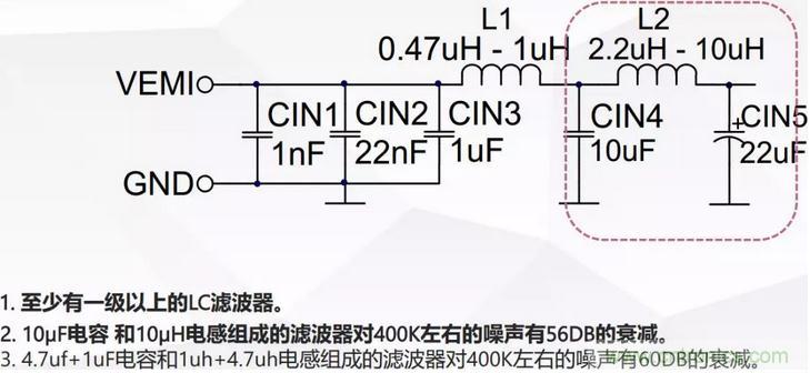 所有的LC濾波器都是以電感結束,并且要遠離DCDC的高頻環路。防止電流環路的近場磁場效應對輸入濾波器的影響。