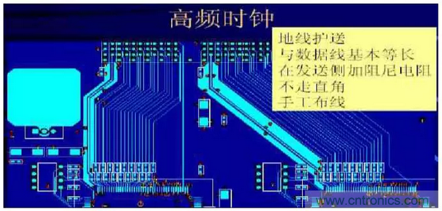 10、高頻信號線要遠離時鐘或晶振走線,如時鐘線和高速信號線盡量不要平行走線,確因實際情況需平行走線,應用地線隔開。