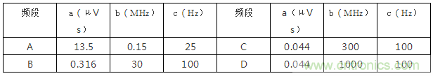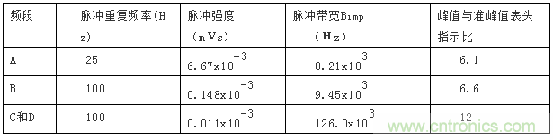 表3的含義是:在A、B、C、D各頻段內,分別輸入各自的標準周期脈沖,要求脈沖的幅度×寬度等于a(μVs),重復頻率為c(Hz),該周期脈沖的頻譜至少應該在b(MHz)以下是均勻的,脈沖信號發生器的源阻抗應和騷擾測量儀輸入阻抗相等。對于該輸人信號,騷擾測量儀在該頻段的任何頻率上的讀數都應該等于60dB(μV)。