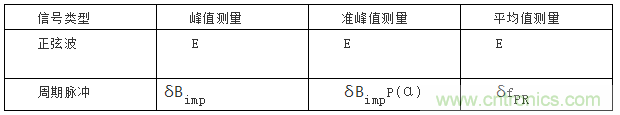 騷擾測量儀可以進行準峰值測量、峰值測量和平均值測量。當輸入信號是正弦波時,無論用何種方式測量,得到的讀數都是相同的,等于該正弦波的有效值,精度應優于±2dB。但是如果輸入的是周期脈沖信號,則三種測量方法得到的讀數是不一樣的,其結果如表7所示。