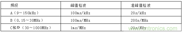 在準峰值測量時,如想要在某個頻率點得到較穩定的測量值,則測量時間應大于檢波器充放電時間和電表機械時間常數之和,并且測量不止一個周期,所以一般準峰值測量時間要求比較長。如果測量儀具有掃頻測量功能,則設置的掃描時間應符合表9的規定。在實際測量中,往往先用峰值進行全頻段測量,然后再對超過限值的頻率點進行峰值測量,這樣可以大大節省測量時間。
