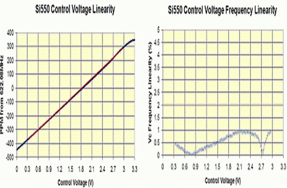 從圖4即可看出在控制電壓的線性方面,以DSPLL為基礎的振蕩器比現有的壓控石英振蕩器或壓控SAW振蕩器還好五倍。Si550會將控制電壓數字化,然后傳給DSPLL頻率合成引擎。這種做法可以免除傳統所需的變容器和它所帶來的非線性特性,進而提供高于其它競爭組件五到十倍的±1線性效能。Si550還提供多種控制范圍(tuning range)讓客戶選擇最適合其應用的組件;相較于采用SAW的解決方案,這種可選擇式控制斜率范圍在同樣的溫度范圍內可以提供更穩定的回路頻寬,進而使得設計更強固可靠。
