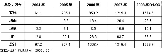 賽迪顧問預(yù)計,整個2008年,有線數(shù)字電視的持續(xù)發(fā)展將給機(jī)頂盒的銷售帶來廣闊的空間。