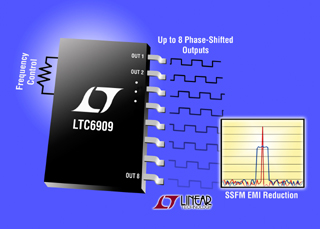 凌力爾特公司 (Linear Technology Corporation) 推出精確硅振蕩器LTC6909,該器件極大地降低了峰值輻射 EMI,并在多相電源中改善了開關穩壓器的控制。LTC6909 有 8 個獨立輸出,提供多達 8 個軌至軌 50% 占空比時鐘信號。這些輸出可以用來啟動或禁止以及實現多個開關穩壓器的相位同步。相位同步提供多種設計優勢,包括改善的 EMI 性能、降低的輸入和輸出紋波電流、以及更好的負載瞬態響應。使用 3 個邏輯輸入,這些輸出之間的相位關系可以從  45o 至 120o  配置,或者輸出可以被置于邏輯低或高 Z 狀態。