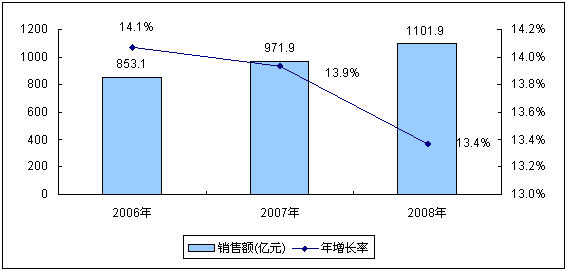 - 2008年銷售額達到1101.9億元,與2007年市場規模相比,增長13.4%
